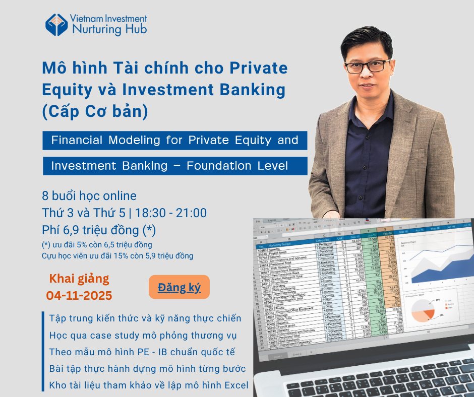 Khóa học Mô hình Tài chính (Cấp cơ bản) của Vietnam Investment Nurturing Hub sẽ giúp bạn trang bị kỹ năng lập mô hình thực chiến, là kỹ năng quan trọng nhất mà các quỹ PE và công ty IB luôn yêu cầu!