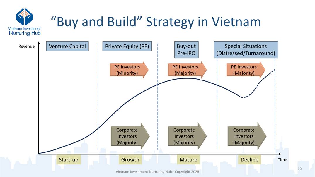 “Buy and Build”chủ yếu được triển khai bởi các Quỹ Đầu tư Cổ phần Chưa Đại chúng (Private Equity – PE) và các tập đoàn lớn. Quỹ PE nhắm đến các công ty đang tăng trưởng, đã trưởng thành, và cả công ty gặp khó khăn. Quỹ PE thường nắm cổ phần thiểu số đáng kể (tối đa 49%) (với công ty tăng trưởng) hoặc cổ phần đa số (với doanh nghiệp trưởng thành hoặc khó khăn).