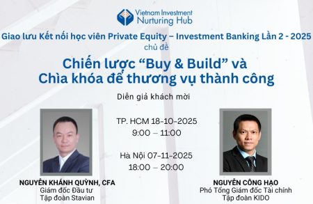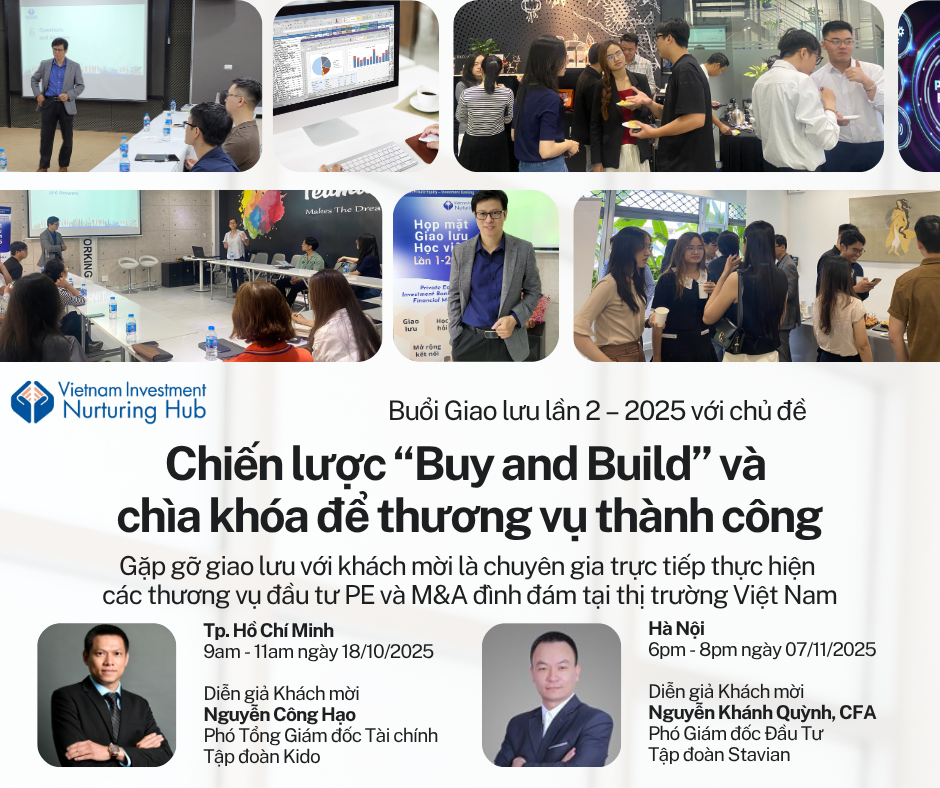 Tiếp nối Buổi Giao lưu Lần 1 – 2025 với khách mời là các chuyên gia của Tổ chức Tài Chính Quốc tế IFC (International Finance Corporation), Buổi Giao lưu lần 2 – 2025, với chủ đề CHIẾN LƯỢC “BUY AND BUILD” VÀ CHÌA KHÓA ĐỂ THƯƠNG VỤ THÀNH CÔNG sẽ là cơ hội quý báu để người tham gia được gặp gỡ, học hỏi từ các diễn giả khách mời là những người làm thương vụ thực chiến dày dạn kinh nghiệm, những chuyên gia trực tiếp triển khai các thương vụ đầu tư PE và M&A đình đám tại thị trường Việt Nam.